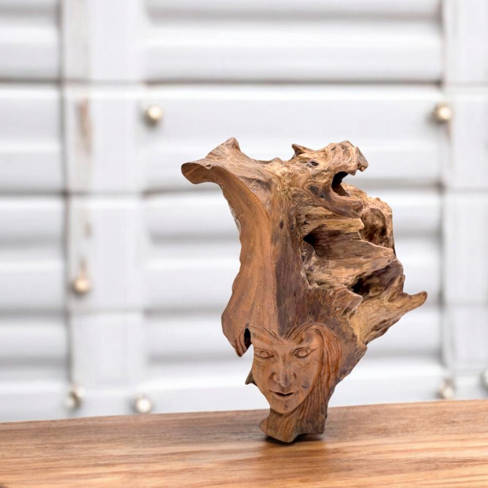 تتميز هذه المنحوتة بتكوينها الفريد الذي يجمع بين القوة والرشاقة. خطوطها المتداخلة تشبه طبقات الزمن المتراكمة، وكأنها سجل حي لتاريخ عريق. تفاصيلها المعقدة تحكي قصة كل عام مر على هذا الخشب النبيل، حيث تظهر التشققات والحلقات الطبيعية كخطوط زمنية تسرد حكاية الماضي.
